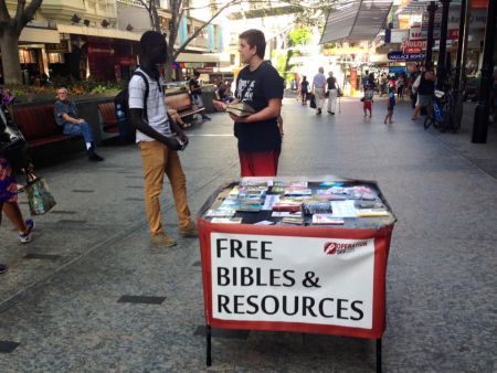 On Saturday night, the evangelism team headed into the Queen St Mall, Brisbane City. As usual there were crowds of people around, despite the dreary weather. After the heavy rain at about 7pm people still flocked into the mall, walking up and down and seeking after fulfillment in the abuse of the pleasures of life.