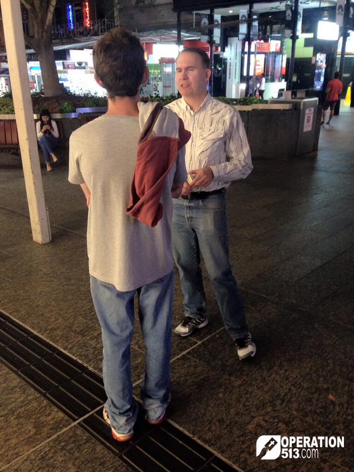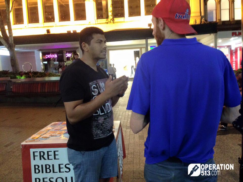 Thank-you to those who prayed for the outreach today. It was a very productive afternoon / evening. We started in the Queen Street Mall at 2pm, and sadly the one Brisbane City Council Local Law Officer who has been giving us grief acted unlawfully once again.