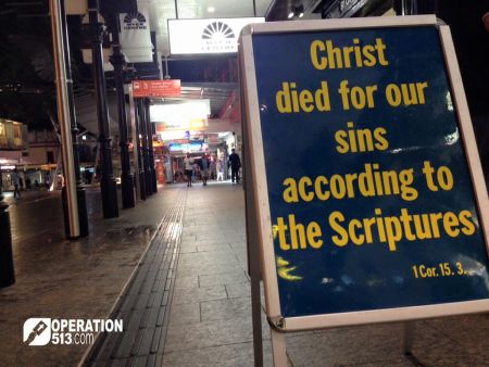 Praise God for a good outreach last night in Brisbane city. We had about 15 of us on the team, and I remember noticing a couple of times throughout the night that every team member was in a gospel conversation with someone.
