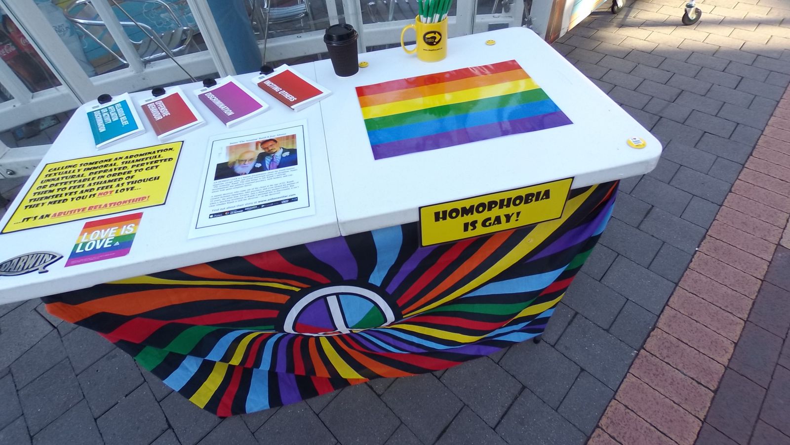 Just as we were packing up on Friday a group of young ladies and a guy stopped and again engaged with our same sex marriage material. In marked contrast to the young lady previous they were very aggressively anti-Christian in their stance and arguments. Numerous times through the discussion I noted that there was no reasons for their thoughts given, only slogans that could easily have been lifted straight from the newspapers or internet. We discussed why Christians disagree with same sex marriage and say homosexuality is a sin. Karl and I both tried to show the balance of love and judgment that God's word responds to these issues. Tragically they left spouting yet another slogan, "You should try to be more open to love..." . May God work in their hearts to show the bankruptcy of the homosexual life and the great love God has shown through Jesus. May they turn to Him from this broken lifestyle.